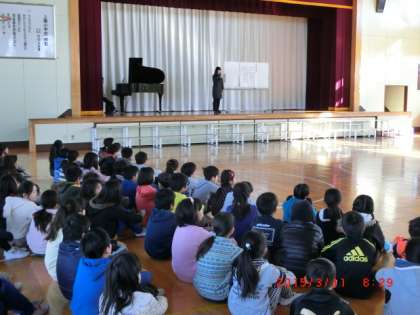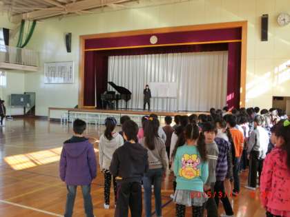 今朝の音楽集会は、体育館に3年生・4年生・5年生に集まってもらい、卒業式の歌練習をしました。
