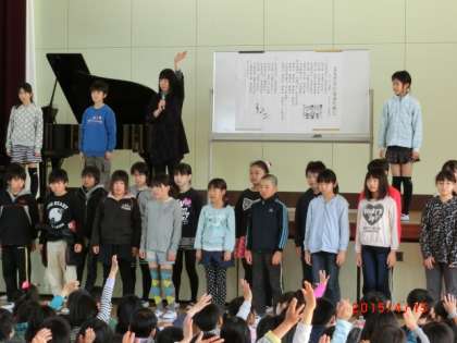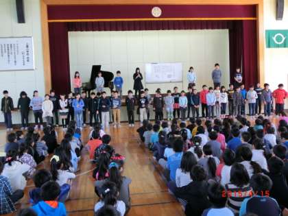 22日に行う「1年生を迎える会」に向けて、2年生〜6年生の児童たちが歌の練習をしました。手話隊が前に出て、歌に合わせて手話の手振りをするのですが、今年は6年生の全児童が手話隊に立候補してくれました。