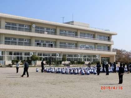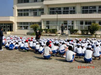 昨日とは一転した青空の下に、2年生〜6年生までの児童たちが集まり、運動集会をしました。今日は、整列の仕方の確認や服装、帽子、体操の隊形などを確認しました。
