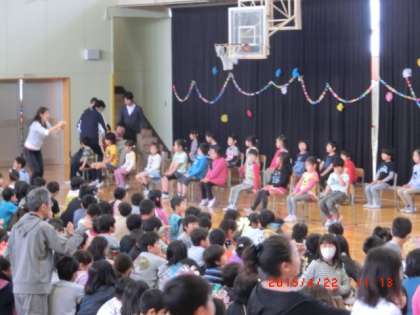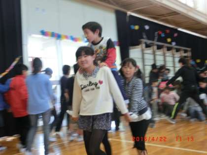 入学から日も経ち、1年生も上陽小になれてきたので、全校児童で1年生の歓迎会を行いました。5・6年生がつくってくれた騎馬にまたがっての入場です。5年生はとうとうこの日が来たのか・・と懐かしそうです。2年生からはペンダント、3年生からはブンブンごま、4年生は風車を作ってプレゼントしました。
