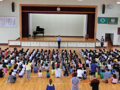 プールサイドでの予定でしたが、あいにくの雨模様のため、体育館でプール開きを行いました。体温計を使っての体調管理、水の事故を防ぎ、安全安心に楽しくプールを利用する方法などを学習しました。