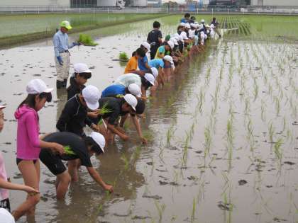 上野村の上野小とフェリーチェ国際小の児童たちと一緒に5年生が「田植え体験」をしました。
