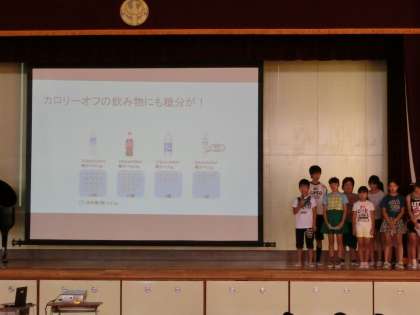 児童集会で保健美化委員が、先週の学校保健委員会のことを発表しました。