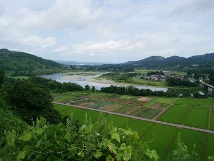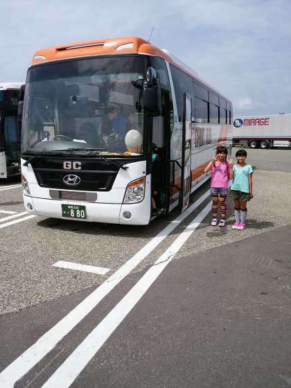 バスに乗って2時間、越後川口SAでひと休み。子ども達は見られませんが、信濃川の流れは一見の価値ありですよ。