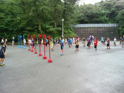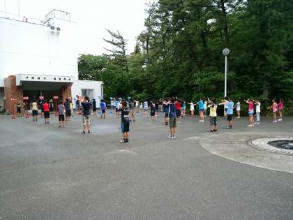 朝の集い。定番、ラジオ体操と上陽小の定番、ジンギスカンで身体を目覚めさせます。