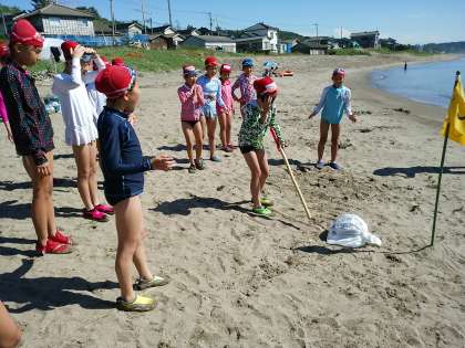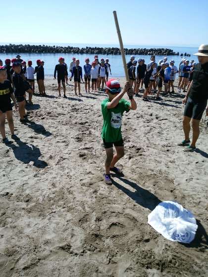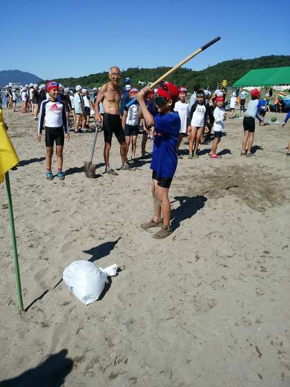 スイカ割りが始まりました!指示の声があちこちから飛び交ってますが、上手く割っていますよ!