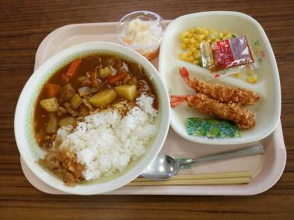臨海学校2日目 公開日 2015/07/20 更新日 2015/07/20 児童の活動 今日の夕食は、カレーライス、エビフライ、コーンサラダ、フルーツとナタデココのヨーグルト和えです!なかなか美味しいカレーですよ!