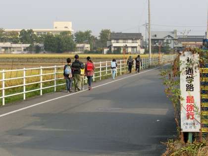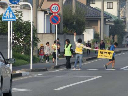 道路横断の状況、旗振りの方へのあいさつ、両手をふさがない持ち物、服装など、おおむね適正でした。出勤時で自動車の通行が多く、路上駐車を避ける車が児童の通行帯(グリーンベルト)に侵入するなどの課題も見つかりました。