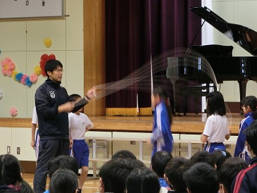 3年生は怪談で知られる『番町皿屋敷』からできた落語「お菊の皿」を劇にして、楽しませてくれました。5年生は、日頃から腕を磨いてきた「なわとび」の妙技を曲に合わせて披露してくれました。