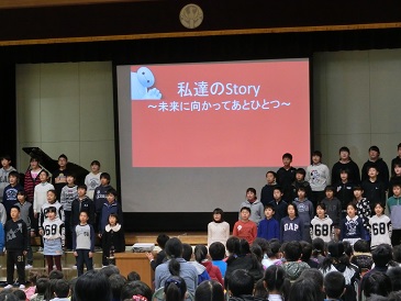 そして、6年生からは、合唱と合奏のお返しがありました。途中ビデオで流れた4年生の時の「ふるさと」の歌声とはちがい、男子は男声になり、床を揺らす迫力で後輩にメッセージを残してくれました。