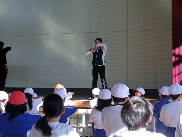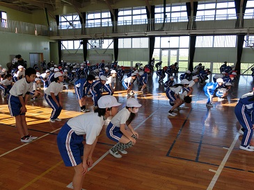 「We are the World」の曲に合わせて、十分なストレッチ運動をやった後、新しいステップを教えてもらいました。児童は、男女を問わず、曲に合わせて身体を動かすことが大好きなようです。