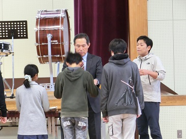 今年度の運動会の入場曲として使ったSEKAI NO OWARIの『炎と森のカーニバル』を児童たちの手拍子に合わせて演奏してくれました。その後、後期の長縄大会の表彰を行いました。