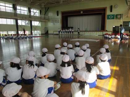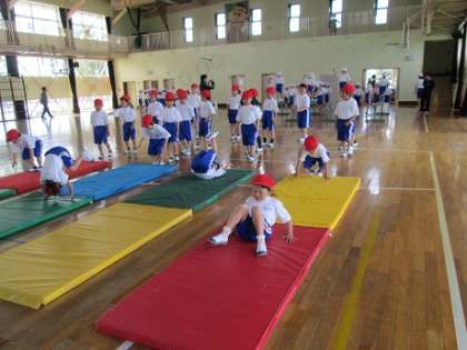 5月9日(木)運動集会でサーキットを行いました。走る、跳ぶ、投げるなどの基礎体力を高める取組です。1・2年生は体育館で、3年生以上は校庭で行います。写真は、1・2年生の様子です。赤帽子が1年生、白帽子が2年生です。5・6年の運動委員の児童がしっかりとサポートをしてくれました。