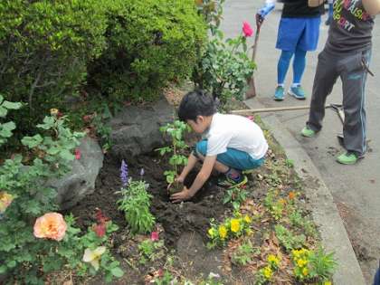 5月22日(水) 学校で、ばらの記念植樹をしました。町の事業「ばらサミットinたまむら」の一環で行ったものです。園芸委員会の児童が、心を込めて丁寧に植樹をしてくれました。