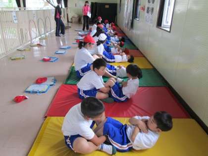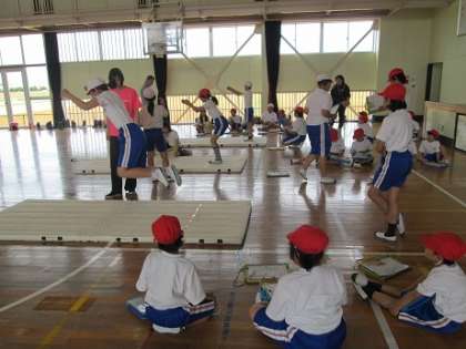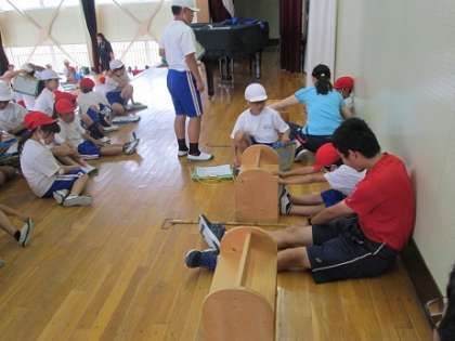 5月29日(水) 新体力テストです。1年生と6年生、2年生と5年生、3年生と4年生がペアになって行います。それぞれ上級生が下級生の補助をしながら計測をします。写真は、1年生と6年生の様子です。(「シャトルラン」は6月4日に行う予定です。)
