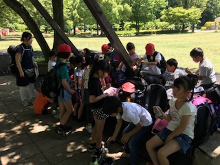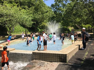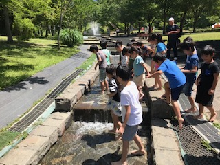 5月30日(木)あたたかく爽やかな日になりました。写真は、じゃぶじゃぶ池で活動をしている様子です。