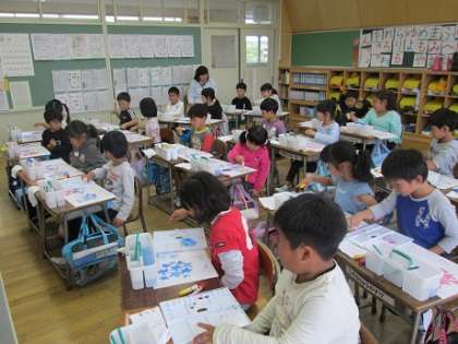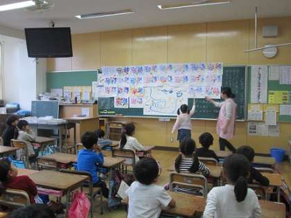 6月10日(月) 1年生の図工で「絵の具講習会」を行いました。講師の先生に絵の具の使い方を楽しく優しく教えていただきました。