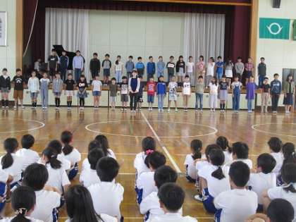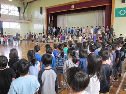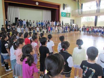 6月12日(水) 朝の時間は音楽集会でした。6月の歌は「ゆかいに歩けば」、めあては「伸びやかな声で歌おう」です。6年生の素晴らしいお手本に合わせて、全校で楽しく歌いました。
