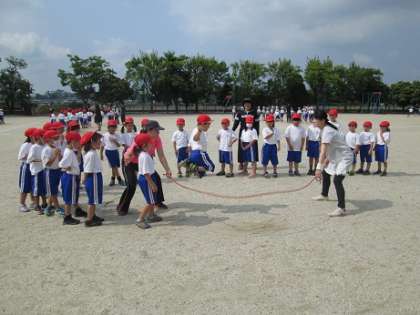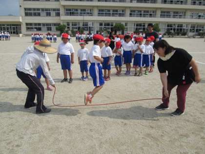 6月20日(木) 朝の時間は運動集会で長縄をしました。学級ごとに跳べた回数を数えます。この日は初めての練習をしました。7月4日に、本番の「長縄大会」をします。写真は1年1組と1年2組です。