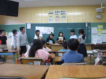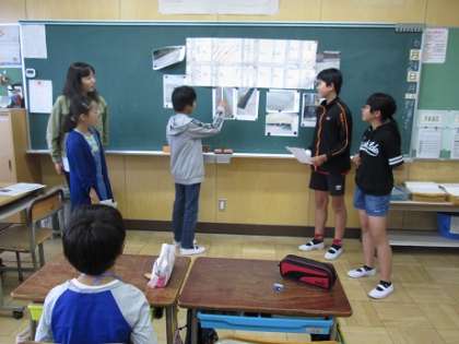6月24日(月) 国語の授業で「ようこそ私たちの町へ」という学習の発表会をしました。6年生が1年生に発表をしました。文章全体の構成の効果を考え、自分の考えを表現する学習です。1年生は、6年生の趣向を凝らした発表を真剣に聞いていました。
