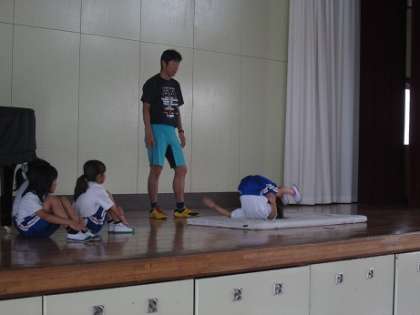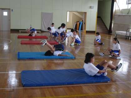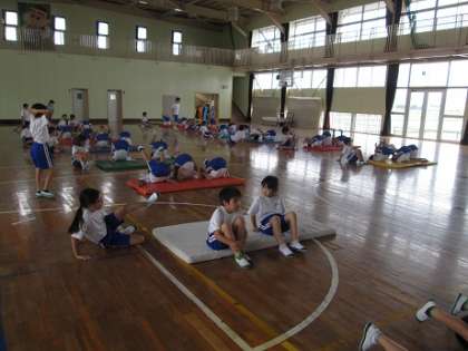 7月5日(金) 4年生の授業の様子です。この時間は、4年1組と4年2組が合同で、体育館でマット運動をしました。ステージの上の友達のお手本を見ながら、小グループで楽しく練習をしました。