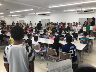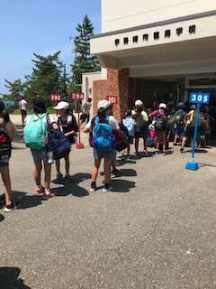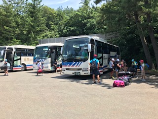予定どおりに時間に臨海学校に到着し入校式を終えました。このあと、1日目の海水浴を行います。