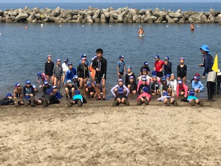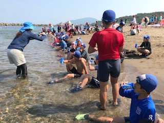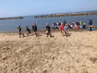 2日目午前の海水浴の様子です。海水浴のほかに、みんなでビーチフラッグをして楽しみました。