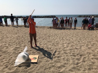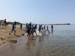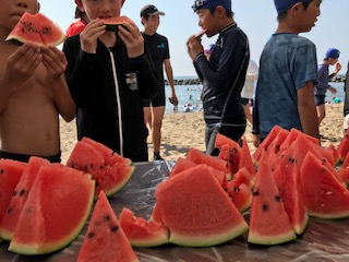 2日目午後の海水浴が終わりました。みんなでスイカ割りをして、冷たいスイカをいただきました。