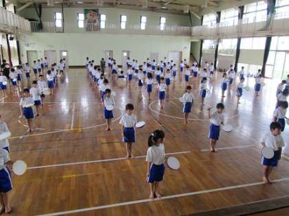 9月2日(月)各学年で運動会の練習が始まりました。写真は、1・2年生の練習の様子です。3・4時間目に、1・2年生の4クラス合同で、表現運動の練習をしました。