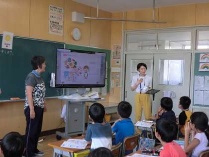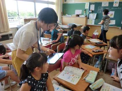 9月17日(火) 夏休み中に校内のICT機器の大規模な入替・導入がありました。児童用タブレットPC35台も全て新しい機種になりました。この日は、町から派遣されたICT支援員さんが授業のお手伝いをしてくれました。学校の先生だけでは行き届きにくいところを、きめ細かくサポートしてくれました。ICT支援員さんが笑顔で大活躍しています。