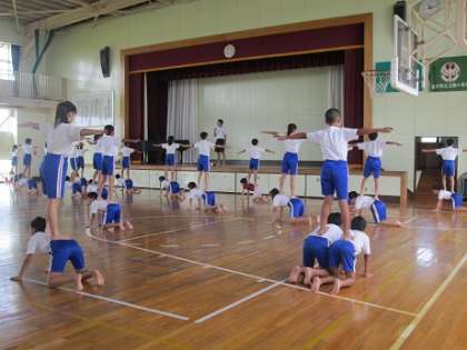9月24日(火)5・6年生の体育の授業です。運動会の組み立て表現の練習です。ピリッと張り詰めた緊張感が漂う体育館で、全員が真剣に、集中して、一生懸命に練習に取り組みました。