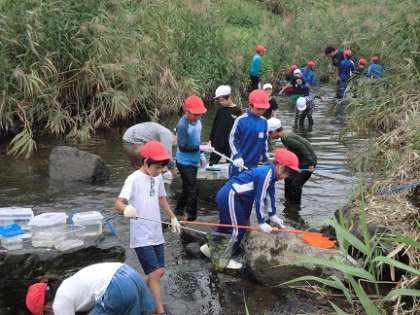 10月3日(木)3年生の総合的な学習の時間では、「郷土」について主体的・対話的で深い学習をしています。テーマは「わたしたちの藤川」。この日は藤川を守る会の皆さんに協力していただき、藤川で魚とりをしました。