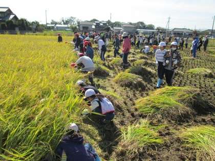 11月2日(土)5年生が6月に田植えをした稲が実り、秋の香りを運ぶ風に吹かれて「稲刈り」をしました。この学習は「総合的な学習の時間」で行っています。上陽小5年生の探究課題は「環境」です。テーマは「米作りから始まる食と環境」です。玉村町農業クラブの皆さんにご指導をいただきながら、実りの秋・収穫の秋を肌で感じることができました。上野村の子供会の皆さんやフェリーチェ玉村国際小学校の友達との交流も深めることができました。