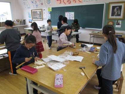 11月22日(金)3年生の授業の様子です。1組は図工「ドンドンドンドンくぎうち名人」です。木片をつなげて思い思いの作品を作りました。2組は国語です。説明の工夫について話し合う授業でした。