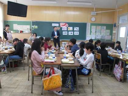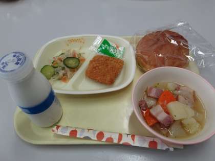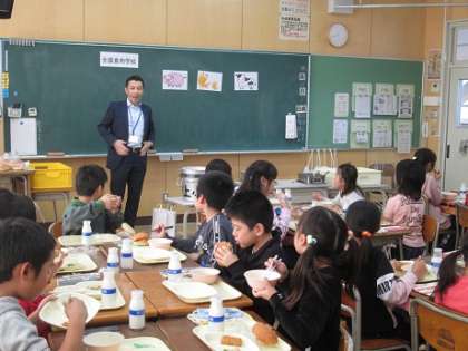 11月26日(火)今日の給食に、食肉学校のベーコンがいっぱい入ったポトフが出ました。3年生の教室では、食肉学校の先生にお肉のお話をしていただきました。香りが豊かで大きなベーコンをみんなでおいしくいただきました