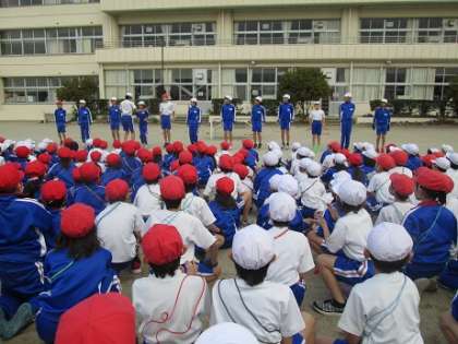 12月19日(木)朝の時間の運動集会で、なわとびをしました。全員で「夢をかなえてドラえもん」を跳んだあと、運動委員の5・6年生が、難しい跳び方のお手本をたくさん披露してくれました。驚きの喚声と大きな拍手に包まれました。