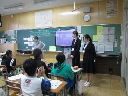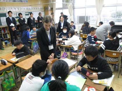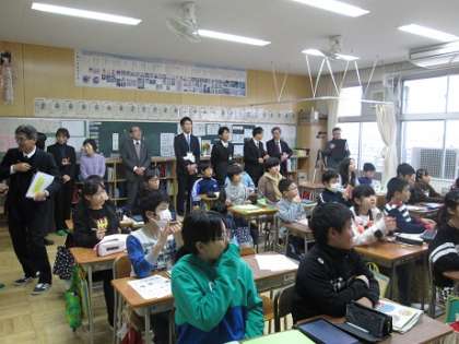 12月19日(木)英語の授業視察があり、たくさんのお客さんが来校しました。授業は6年2組で行いました。これからの小学校英語の在り方、ICT機器の活用、ICT支援員やALTの役割など、様々な観点から授業を見ていただきました。児童は、いつもどおり元気に明るく、大変よく頑張りました。笑顔と活気のある授業になりました。