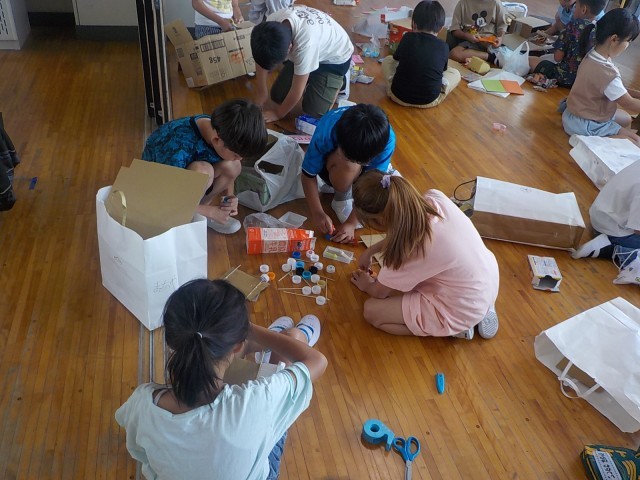 的当てゲームや後ろから風を送って走らせる車、輪ゴムの力で高く飛ばすカエルなど、工夫を凝らして作っていました。