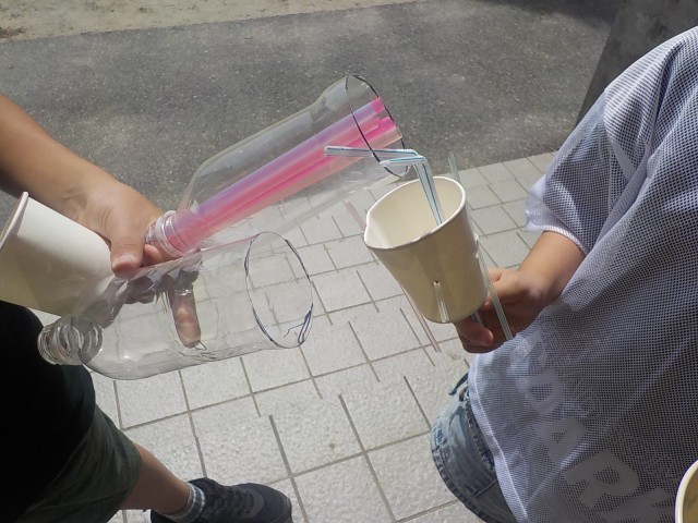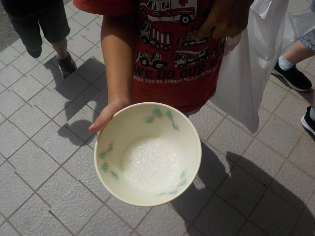 いろいろな容器を好きな形に切って、シャボン玉をとばしました。