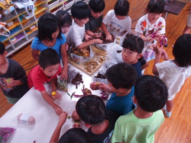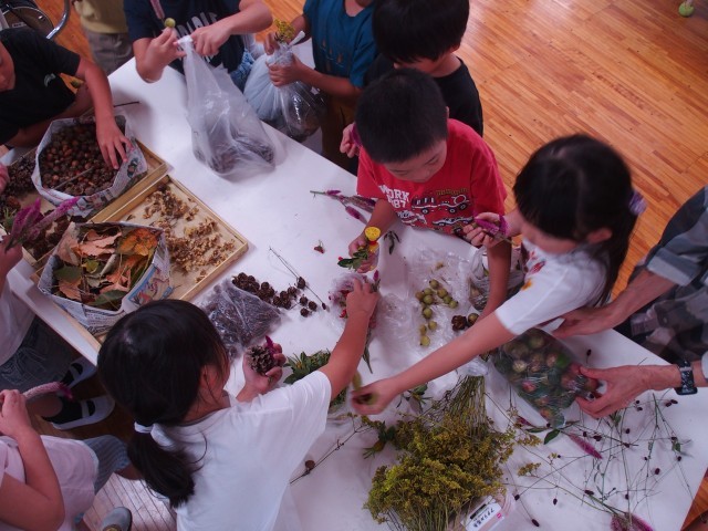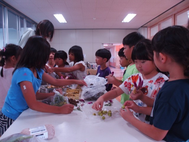 先日校庭で秋を見つけに行ったときに、たくさんのどんぐりを使って、リースづくりをしました。