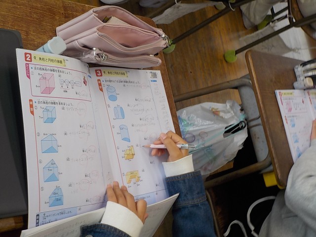 いろいろな形の角柱や円柱の体積を求める学習をしました。