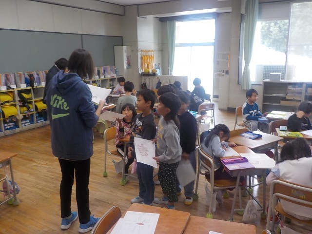 1年生がお家のひとに、知らせたいものをえらんで、どんなことを伝えたいかをまとめていました。