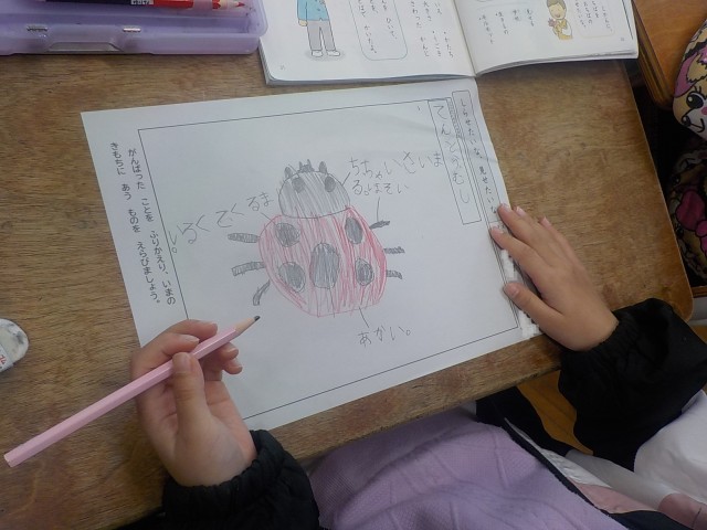 校庭で採取したコオロギとテントウ虫をみんなで観察しながらまとめていました。