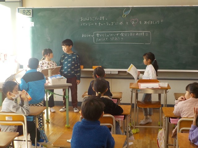 日直さんが前に出て、「○○さん元気ですか」と言うと、「ハイ元気です!」「ハンカチ忘れたけど、元気です!」を事得ていました。