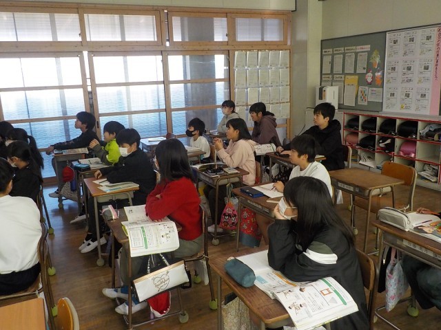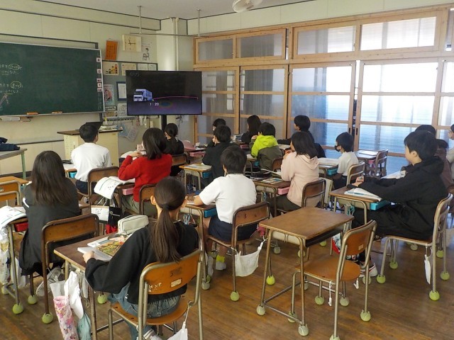 7トントラックをながーい鉄柱を使って持ち上げる動画を、6年生が興味津々で見ていました。