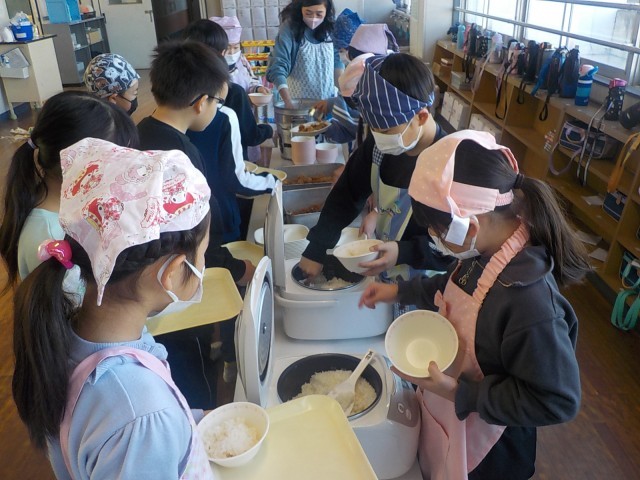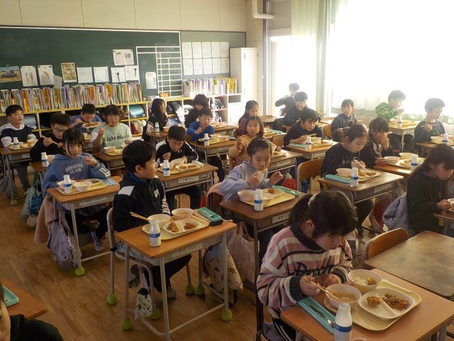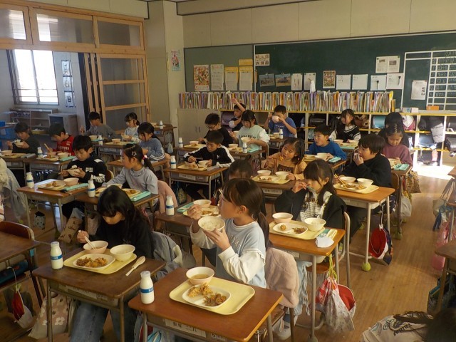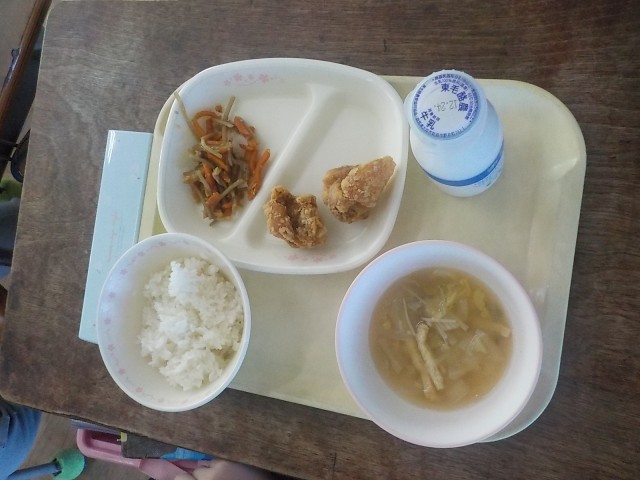 3年生は「おいしい」「あたたかい」と言いながら、メニューのから揚げと一緒にご飯をほおばっていました。