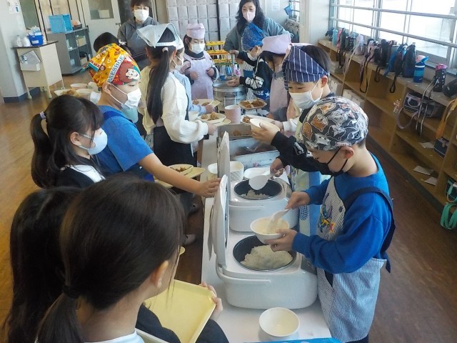 今年芝根小の3年生が、夏に田植えをして、秋に稲刈りをしたあのお米を使っての給食でした。