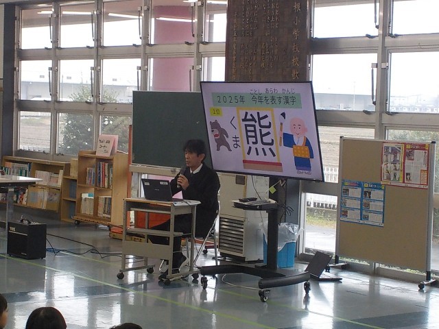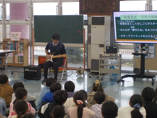 校長先生の今年の漢字は、挑戦の「挑」です。理由は①今年校長先生としての仕事がスタート ②みんなに「夢のたね」をたくさん見つけてもらうように取り組んだ ③ギターでライラックを上手に弾けるようにチャレンジした の3つです。