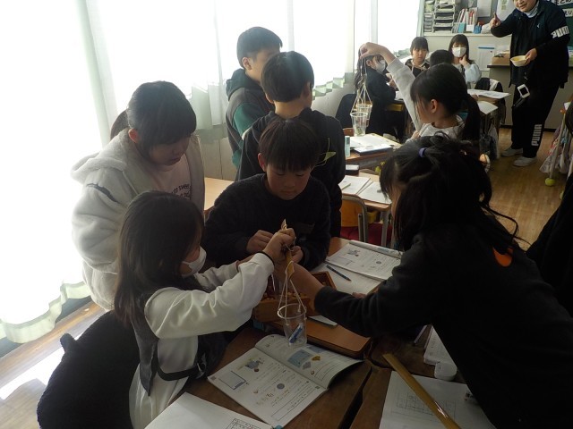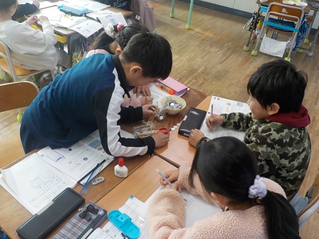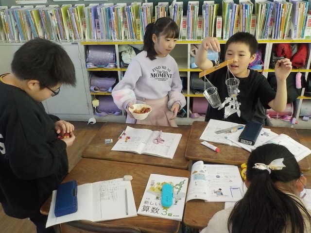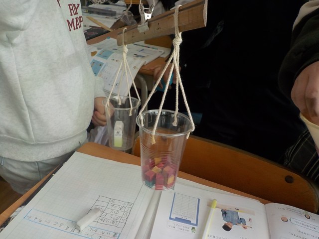 1円玉と積み木を使って、ノリやハサミの重さをはかっていました。