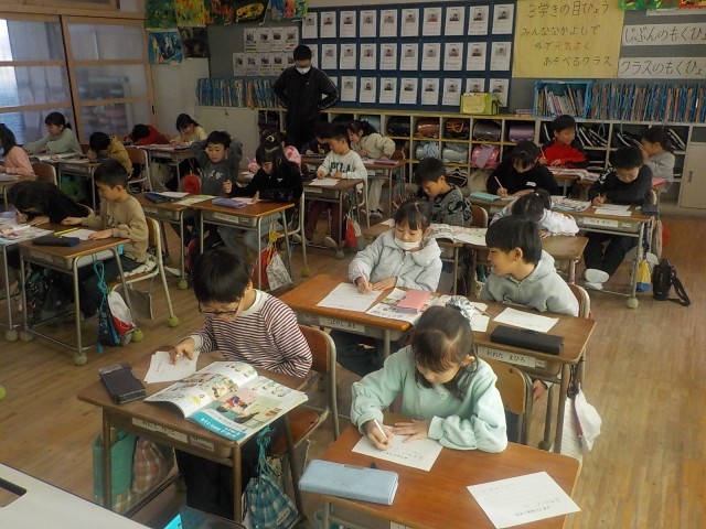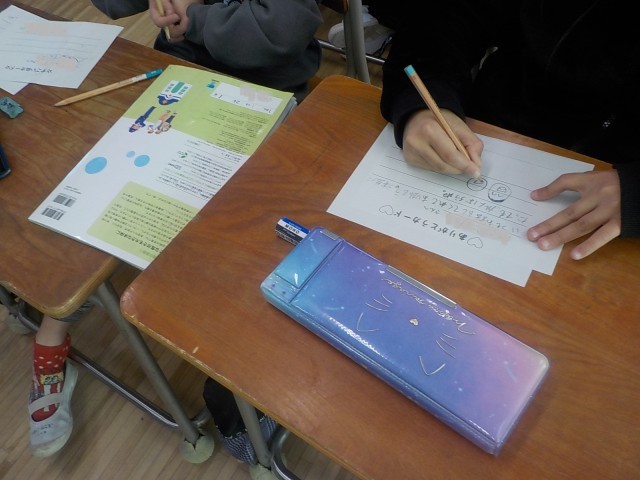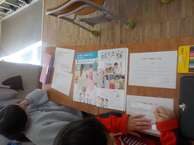 隣の人と「ありがとうカード」と「すごいねカード」交換するために書いていました。